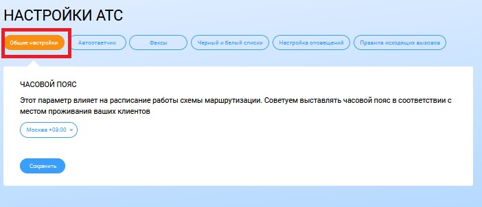 Часовой пояс, указанный в этом разделе, влияет на правила, заданные в разделе "Маршрутизация" и на отображение вызовов в разделе "Журнал"