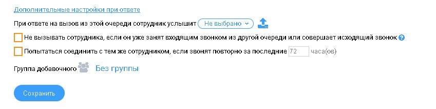 "Попытаться соединить с тем же сотрудником, если звонят повторно" означает, что система попытается соединить конкретного звонящего с конкретным агентом, с которым уже состоялся разговор в течение указанного времени. Если соединить не получится, либо звонящий ранее ни с кем не общался, вызов пойдет по стратегии обзвона очереди. Эта настройка актуальна, когда ваш клиент звонил и уже общался с кем-то по определенному вопросу, в данном случае агент будет в курсе первичного обращения